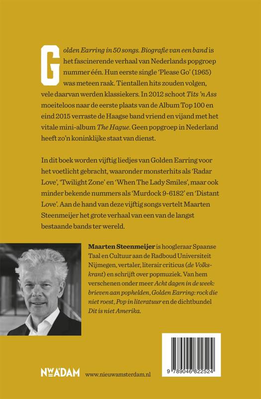 Golden Earring in 50 songs. Biografie van een band is het fascinerende verhaal van Nederlands popgroep nummer één. Hun eerste single 'Please Go' (1965) was meteen raak. Tientallen hits zouden volgen, vele daarvan werden klassiekers. In 2012 schoot Tits 'N Ass moeiteloos naar de eerste plaats van de Album Top 100 en eind 2015 verraste de Haagse band vriend en vijand met het vitale mini-album The Hague. Geen popgroep in Nederland heeft zo'n koninklijke staat van dienst als Golden Earring. In dit boek worden vijftig liedjes van Golden Earring voor het voetlicht gebracht. Per hoofdstuk wordt het verhaal verteld van hits als 'Radar Love', 'Twilight Zone' en 'When The Lady Smiles', maar ook van minder bekende, maar opvallende nummers als 'Murdock 9-6182' en 'Distant Love'. Aan de hand van deze vijftig kleine verhalen vertelt Golden Earring-kenner Maarten Steenmeijer het grote verhaal van een van de langst bestaande bands ter wereld.