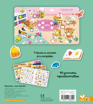 Un cahier de 24 pages sur le thème de l'école maternelle proposant des décors à colorier et compléter avec plus de 400 gommettes repositionnables : des gommettes géométriques unies ou à motifs (ronds, carrés, rectangles, triangles, étoiles...) et des gommettes silhouettées. Dans chaque scène (salle de classe, cour de récré, cantine, préau, etc.), un texte court raconte à l'enfant ce qui s'y passe.