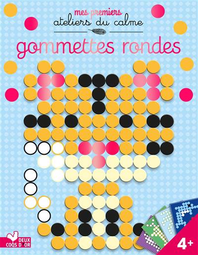4 tableaux mystères en pixels ronds à compléter grâce à 8 planches de gommettes rondes repositionnables. L'enfant est invité à coller les gommettes selon la légende donnée dans le livret explicatif pour découvrir de jolis dessins !