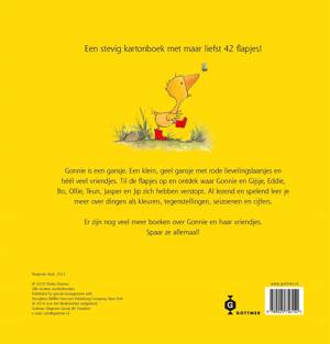 Gonnie is een gansje. Een klein, geel gansje met rode lievelingslaarsjes en héél veel vriendjes. Til de flapjes op en ontdek waar Gonnie en Gijsje, Eddie, Bo, Ollie, Teun, Jasper en Jip zich hebben verstopt. Al lezend en spelend leer je in 'Gonnie & vriendjes in ganzenpas' meer over dingen als kleuren, tegenstellingen, seizoenen en cijfers.