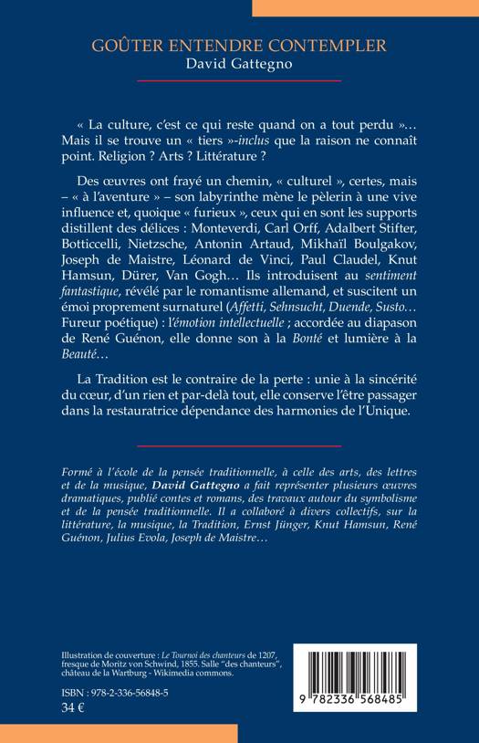 La culture, c'est ce qui reste quand on a tout perdu ... Mais il se trouve un tiers -inclus que la raison ne connaît point. Religion ? Arts ? Littérature ? Des oeuvres ont frayé un chemin, culturel, certes, mais - à l'aventure - son labyrinthe mène le pèlerin à une vive influence et, quoique furieux, ceux qui en sont les supports distillent des délices: Monteverdi, Carl Orff, Adalbert Stifter, Botticcelli, Nietzsche, Antonin Artaud, Mikhaïl Boulgakov, Joseph de Maistre, Léonard de Vinci, Paul Claudel, Knut Hamsun, Dürer, Van Gogh... Ils introduisent au sentiment fantastique, révélé par le romantisme allemand, et suscitent un émoi proprement surnaturel (Affetti, Sehnsucht, Duende, Susto... Fureur poétique): l'émotion intellectuelle; accordée au diapason de René Guénon, elle donne son à la Bonté et lumière à la Beauté... La Tradition est le contraire de la perte: unie à la sincérité du coeur, d'un rien et par-delà tout, elle conserve l'être passager dans la restauratrice dépendance des harmonies de l'Unique.