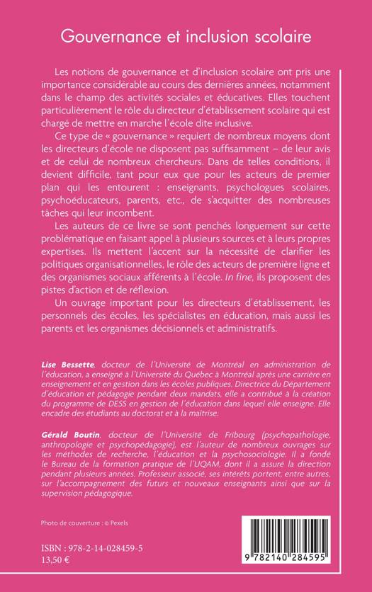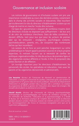 Les notions de gouvernance et d'inclusion scolaire ont pris une importance considérable au cours des dernières années, notamment dans le champ des activités sociales et éducatives. Elles touchent particulièrement le rôle du directeur d'établissement scolaire qui est chargé de mettre en marche l'école dite inclusive. Ce type de « gouvernance » requiert de nombreux moyens dont les directeurs d'école ne disposent pas suffisamment de leur avis et de celui de nombreux chercheurs. Dans de telles conditions, il devient difficile, tant pour eux que pour les acteurs de premier plan qui les entourent : enseignants, psychologues scolaires, psychoéducateurs, parents, etc., de s'acquitter des nombreuses tâches qui leur incombent. Les auteurs de ce livre se sont penchés longuement sur cette problématique en faisant appel à plusieurs sources et à leurs propres expertises. Ils mettent l'accent sur la nécessité de clarifier les politiques organisationnelles, le rôle des acteurs de première ligne et des organismes sociaux afférents à l'école. In fine, ils proposent des pistes d'action et de réflexion. Un ouvrage important pour les directeurs d'établissement, les personnels des écoles, les spécialistes en éducation, mais aussi les parents et les organismes décisionnels et administratifs.