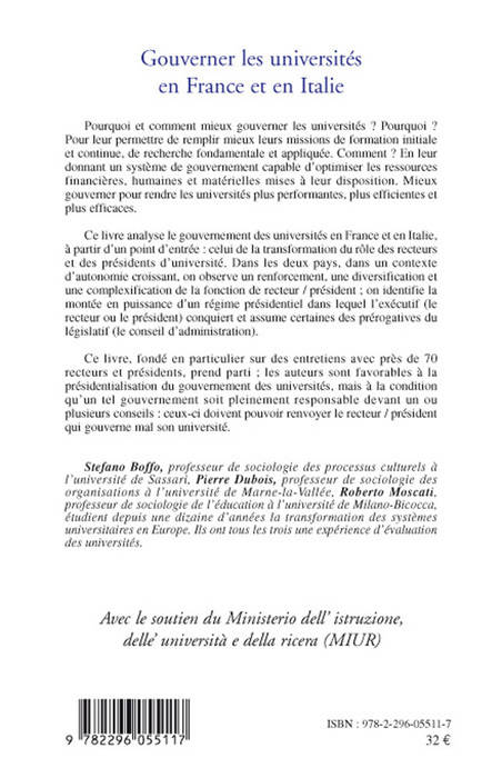 Ce livre analyse le gouvernement des universités en France et en Italie dans un contexte d'autonomie croissante, où l'on observe un renforcement, une diversification et une complexification des fonctions de recteur/président et où l'on identifie la montée en puissance du régime présidentiel dans lequel l'exécutif (le recteur ou le président) assume des prérogatives du législatif (conseil d'administration). Fondé sur 70 entretiens de recteurs et présidents, ce livre prend parti pour la présidentialisation du gouvernement des universités, à conditions qu'il soit responsable devant un ou plusieurs conseils.