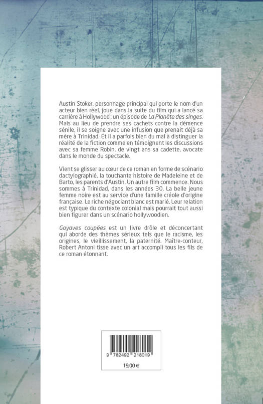 "Goyaves coupées", qui se présente comme un scénario, est un hommage à la célèbre franchise "La Planète des Singes", tout autant que l’occasion de déconstruire ce que cette saga dit de la notion de race. Le scénario fonctionne sur plusieurs niveaux. Dans certaines scènes, Austin Stoker, acteur sur le retour, est aux prises avec sa prostate et ses pertes de mémoire, sujets récurrents de plaisanterie avec d’autres acteurs aussi âgés que lui. Dans d’autres, situées dans le monde post-apocalyptique du film en train d’être tourné, un raid bon enfant permet de sauver une preuve compromettante dans les archives d’humains mutants qui ont juré de mener la civilisation simienne à sa perte. À cela s’ajoute le film-dans-le-film, l’émouvante histoire de la mère d’Austin, Madeleine, domestique noire d’une riche maison créole française dans la Trinidad des années 30, et de sa relation avec Barto, le père d’Austin, le maître blanc dont les agissements en disent long sur les pratiques de la période coloniale. "Goyaves coupées" est un livre hybride par la forme (textes, photographies, adresses Internet), un livre multiple par les thèmes (racisme, origines, vieillissement, paternité...), où l’humour est omniprésent. Auteur au fait de son art, Robert Antoni joue avec les codes narratifs et s’amuse à mener ses lecteurs de surprises en interrogations. Robert Antoni est né en 1958 aux États-Unis de parents trinidadiens. Il a grandi aux Bahamas où son père était médecin et vit aujourd'hui à Brooklyn. Romancier et universitaire, il enseigne l’écriture créative à Cedar Crest College, Pennsylvanie.