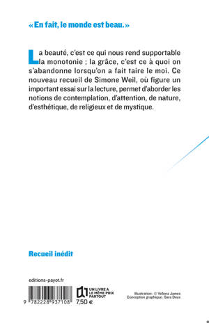 « En fait, le monde est beau. » La beauté, c'est ce qui nous rend supportable la monotonie ; la grâce, c'est ce à quoi on s'abandonne lorsqu'on a fait taire le moi. Ce nouveau recueil de Simone Weil, où figure un important essai sur la lecture, permet d'aborder les notions de contemplation, d'attention, de nature, d'esthétique, de religieux et de mystique.