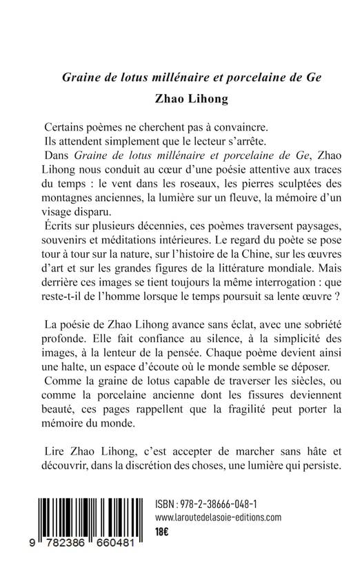 Certains poèmes ne cherchent pas à convaincre. Ils attendent simplement que le lecteur s'arrête. Dans "Graine de lotus millénaire et porcelaine de Ge, Zhao Lihong nous conduit au coeur d'une poésie attentive aux traces du temps : le vent dans les roseaux, les pierres sculptées des montagnes anciennes, la lumière sur un fleuve, la mémoire d'un visage disparu. Écrits sur plusieurs décennies, ces poèmes traversent les paysages, les souvenirs et les méditations intérieures. Le regard du poète se pose tour à tour sur la nature, sur l'histoire de la Chine, sur les oeuvres d'art et sur les grandes figures de la littérature mondiale. Mais derrière ces images se tient toujours la même interrogation : que reste-t-il de l'homme lorsque le temps poursuit sa lettre oeuvre ? La poésie de Zhao Lihong avance sans éclat, avec une sobriété profonde. Elle fait confiance au silence, à la simplicité des images, à la lenteur de la pensée. Chaque poème devient ainsi une halte, un espace d'écoute où le monde semble se déposer. Comme la graine de lotus capable de traverse les siècles, ou comme la porcelaine ancienne dont les fissures deviennent beauté, ces pages rappellent que la fragilité peut porter la mémoire du monde. Lire Zhao Lihong, c'est accepter de marcher sans hâte et découvrir, dans la discrétion des choses, une lumière qui persiste. Soulignons ici que le livre est en bilingue.
