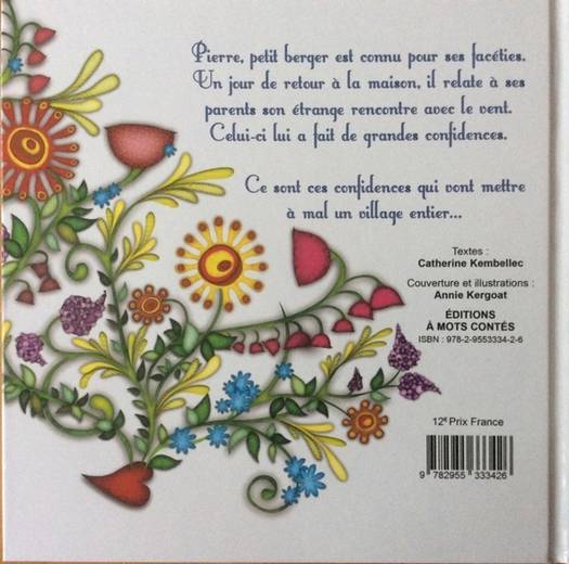 Les facéties et fabulations des enfants sont elles graves ? Pierre, petit berger est connu pour ses facéties. Un jour de retour à la maison, il relate à ses parents son étrange rencontre avec le vent. Celui-ci lui a fait de grandes confidences. Ce sont ces confidences qui vont mettre à mal un village entier.... Plusieurs niveaux de lecture. PRIX LITTÉRATURE JEUNESSE 2014 décerné par les Bibliothèques Pour Tous