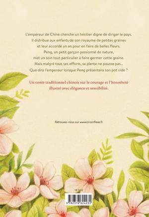 Il y a fort longtemps, le vieil empereur de Chine cherchait un héritier digne de diriger le pays. Pour ce faire, il distribua des graines à plusieurs enfants, leur accordant un an pour les faire pousser. Tous parvinrent à faire grandir une magnifique plante, excepté Peng d’ordinaire très doué dans ce domaine. Mais ce qui semble être un échec ne révélerait-il pas finalement le courage et la vertu du jeune garçon ? La poésie de ce conte traditionnel asiatique rappellera à votre enfant que l’on gagne toujours à être honnête.