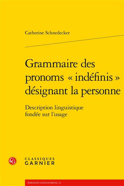 La question des indéfinis, de leur classement et de leur description, reste un problème pour les grammaires et certaines descriptions linguistiques, vu leur hétérogénéité catégorielle (pronoms et/ou déterminants et/ou adverbes), leur diversité formelle (quelqu'un, je ne sais qui...) et l'extrême variété des approches (linguistique formelle, syntaxe de l'oral, typologie, grammaire...). Cet ouvrage, limité aux pronoms dits « indéfinis » référant à la personne, vise, d'une part, à faire ressortir leur cohérence formelle, permettant l'établissement de sous-classifications opérantes, et, d'autre part, à analyser et décrire leur fonctionnement et leur grammaire, à l'aide des bases de données de l'écrit et de l'oral.