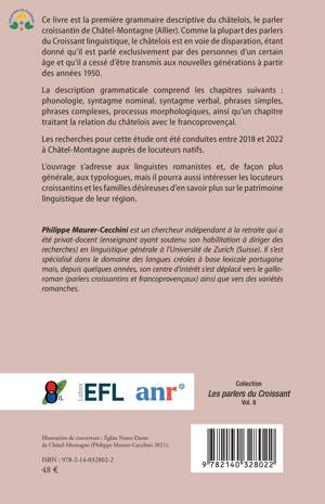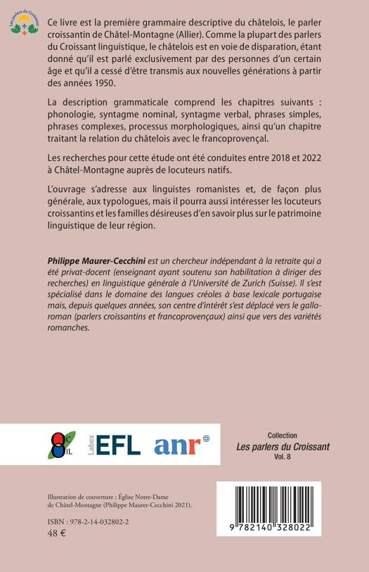 Ce livre est la première grammaire descriptive du châtelois, le parler croissantin de Châtel-Montagne (Allier). Comme la plupart des parlers du Croissant linguistique, le châtelois est en voie de disparation, étant donné qu'il est parlé exclusivement par des personnes d'un certain âge et qu'il a cessé d'être transmis aux nouvelles générations à partir des années 1950. La description grammaticale comprend les chapitres suivants: phonologie, syntagme nominal, syntagme verbal, phrases simples, phrases complexes, processus morphologiques, ainsi qu'un chapitre traitant la relation du châtelois avec le francoprovençal. Les recherches pour cette étude ont été conduites entre 2018 et 2022 à Châtel-Montagne auprès de locuteurs natifs. L'ouvrage s'adresse aux linguistes romanistes et, de façon plus générale, aux typologues, mais il pourra aussi intéresser les locuteurs croissantins et les familles désireuses d'en savoir plus sur le patrimoine linguistique de leur région.