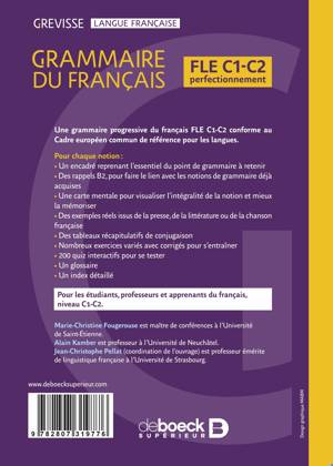 La grammaire FLE de Grevisse, la référence en langue française. Avec résumés des règles et rappels B2, cartes mentales et exercices en ligne.Une grammaire progressive du français FLE C1-C2 conforme au Cadre européen commun de référence pour les langues.