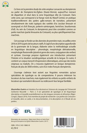 Ce livre est la première étude d'une telle ampleur consacrée au dompierrois ou parler de Dompierre-les-Églises (Haute-Vienne), aujourd'hui menacé de disparition et situé dans la zone linguistique dite du Croissant. L'ouvrage s'adresse tout autant aux linguistes romanistes qu'aux spécialistes de typologie ou de comparatisme. Il pourra intéresser les locuteurs du bas-marchois, mais également les enfants et petits-enfants qui souhaitent découvrir ou redécouvrir leur langue familiale.