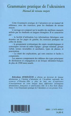 Cette Grammaire pratique de l'ukrainien est un manuel de référence, avec des exercices, qui se caractérise par : la facilité d'utilisation, le groupement systématique des sujets morphologiques et syntaxiques suivant un ordre logique et la clarté des explications. Les annexes comprennent des tableaux des types principaux de déclinaison et conjugaison et un lexique ukrainien-français de plus de 2500 mots usuels.