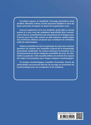 Traitant essentiellement de la morphologie du russe (avec certaines questions de syntaxe sans lesquelles l'exposé de la morphologie deviendrait inutilisable), les auteurs décrivent la formation et le fonctionnement de douze catégories essentielles du russe, du substantif à la particule. Un lexique terminologique complète l'ensemble. Autant de particularités qui pourront faire de cet ouvrage un instrument de travail pratique pour les enseignants et les étudiants.