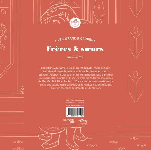 Chez Disney, la famille, c'est sacré ! Dispute, réconciliation, entraide et repas familiaux animés, les frères et soeurs des chefs-d'oeuvre Disney et Pixar ne manquent pas d'affirmer leurs caractères. Les soeurs Anna et Elsa, les trois petits frères malicieux de Merida, Riri, Fifi et Loulou... Tous te donnent rendez-vous entre ces pages. Retrouve-les dans 45 illustrations inédites pour un moment d'émotion.