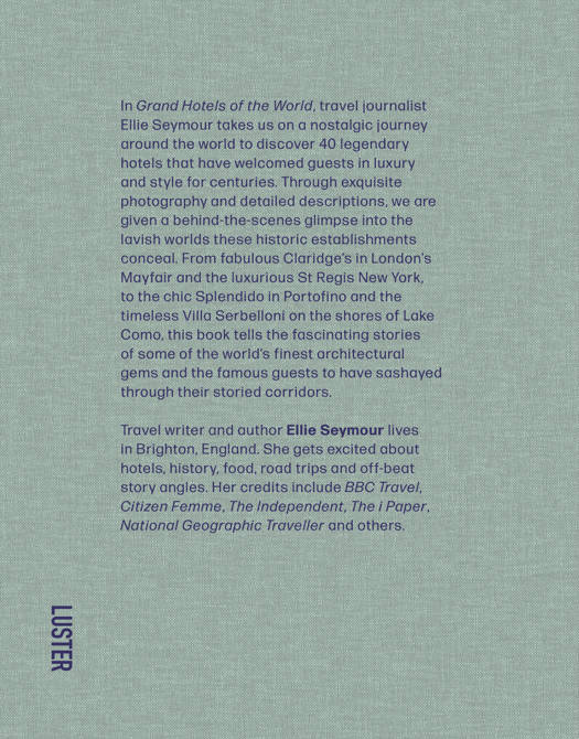 In Grand Hotels of the World, travel journalist Ellie Seymour takes us on a nostalgic journey around the world to discover 40 legendary hotels that have welcomed guests in luxury and style for centuries. Through exquisite photography and detailed descriptions, we are given a behind-the-scenes glimpse into the lavish worlds these historic establishments conceal. From fabulous Claridge’s in London’s Mayfair and the luxurious St Regis New York, to the chic Splendido in Portofino and the timeless Villa Serbelloni on the shores of Lake Como, this book tells the fascinating stories of some of the world’s finest architectural gems and the famous guests to have sashayed through their storied corridors.
