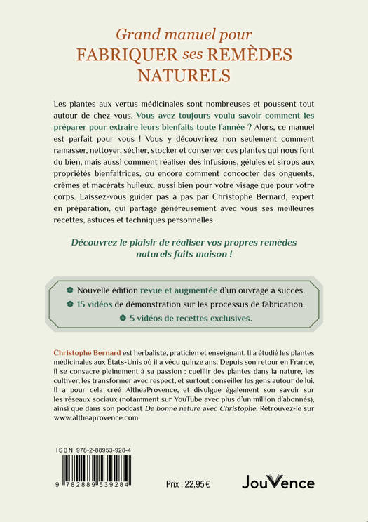 Les plantes aux vertus médicinales sont nombreuses et poussent tout autour de chez vous. Vous avez toujours voulu savoir comment les préparer pour extraire leurs bienfaits toute l’année ? Alors, ce manuel est parfait pour vous ! Vous y découvrirez non seulement comment ramasser, nettoyer, sécher, stocker et conserver ces plantes qui nous font du bien, mais aussi comment réaliser des infusions, gélules et sirops aux propriétés bienfaitrices, ou encore comment concocter des onguents, crèmes et macérats huileux, aussi bien pour votre visage que pour votre corps. Laissez-vous guider pas à pas par Christophe Bernard, expert en préparation, qui partage généreusement avec vous ses meilleures recettes, astuces et techniques personnelles.