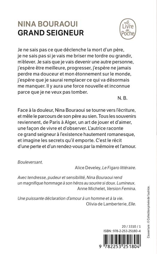 Face à la douleur, Nina Bouraoui se tourne vers l’écriture, et mêle le parcours de son père au sien. Tous les souvenirs reviennent, de Paris à Alger, un art de jouer et d’aimer, une façon de vivre et d’observer. L’autrice raconte ce grand seigneur à l’existence hautement romanesque, et imagine les secrets qu’il emporte. C’est le récit d’une perte et d’un rendez-vous par la mémoire et l’amour.