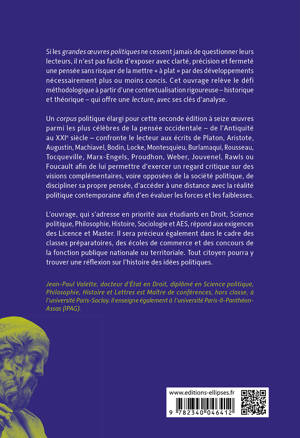 Un corpus politique élargi pour cette seconde édition à seize œuvres parmi les plus célèbres de la pensée occidentale – de l’Antiquité au XXIe siècle – confronte le lecteur aux écrits de Platon, Aristote, Augustin, Machiavel, Bodin, Locke, Montesquieu, Burlamaqui, Rousseau, Tocqueville, Marx-Engels, Proudhon, Weber, Jouvenel, Rawls ou Foucault afin de lui permettre d’exercer un regard critique sur des visions complémentaires, voire opposées de la société politique, de discipliner sa propre pensée, d’accéder à une distance avec la réalité politique contemporaine afin d’en évaluer les forces et les faiblesses.