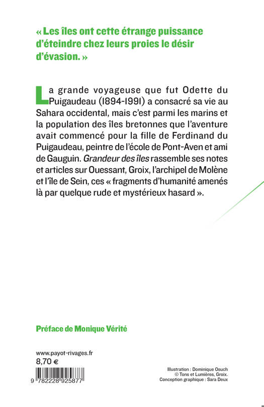 La grande voyageuse que fut Odette du Puigaudeau (1894-1991) a consacré sa vie au Sahara occidental, mais c'est parmi les marins et la population des îles bretonnes que l'aventure avait commencé pour la fille de Ferdinand du Puigaudeau, peintre de l'école de Pont- Aven et ami de Gauguin. «Grandeur des îles» rassemble ses notes et articles sur Ouessant, Groix, l'archipel de Molène et l'île de Sein, ces "fragments d'humanité amenés là par quelque rude et mystérieux hasard".