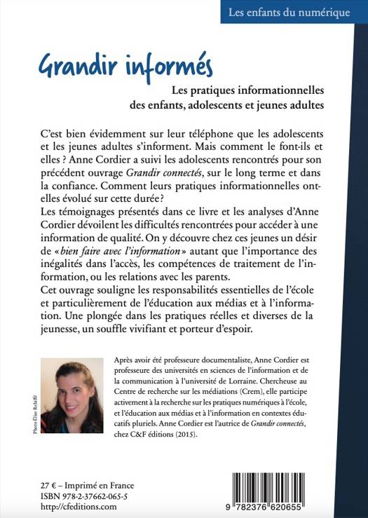 C’est bien évidemment sur leur téléphone que les adolescents et les jeunes adultes s’informent. Mais comment le font-ils et elles ? Anne Cordier a suivi les adolescents rencontrés pour son précédent ouvrage Grandir Connectés, sur le long terme et dans la confiance. Comment leurs pratiques informationnelles ont-elles évolué sur cette durée ? Les témoignages présentés dans ce livre et les analyses d’Anne Cordier dévoilent les difficultés rencontrées pour accéder à une information de qualité. On y découvre chez ces jeunes un désir de «bien faire avec l’information» autant que l’importance des inégalités dans l’accès, les compétences de traitement de l’information, ou les relations avec les parents. Cet ouvrage souligne les responsabilités essentielles de l’école et particulièrement de l’éducation aux médias et à l’information. Une plongée dans les pratiques réelles et diverses de la jeunesse, un souffle vivifiant et porteur d’espoir.