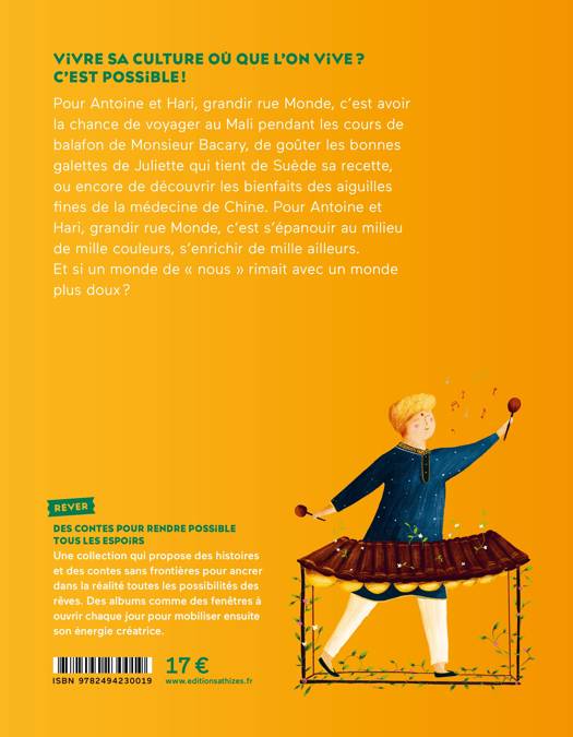 Pour Antoine et Hari, grandir rue Monde, c'est avoir la chance de voyager au Mali pendant les cours de balafon de monsieur Bacary, de goûter les bonnes galettes de Juliette qui tient de Suède sa recette, ou encore de découvrir les bienfaits des aiguilles fines de la médecine de Chine. Pour Antoine et Hari, grandir rue Monde, c'est s'épanouir au milieu de mille couleurs, s'enrichir de mille ailleurs. Et si un monde de "nous" rimait avec un monde plus doux ?