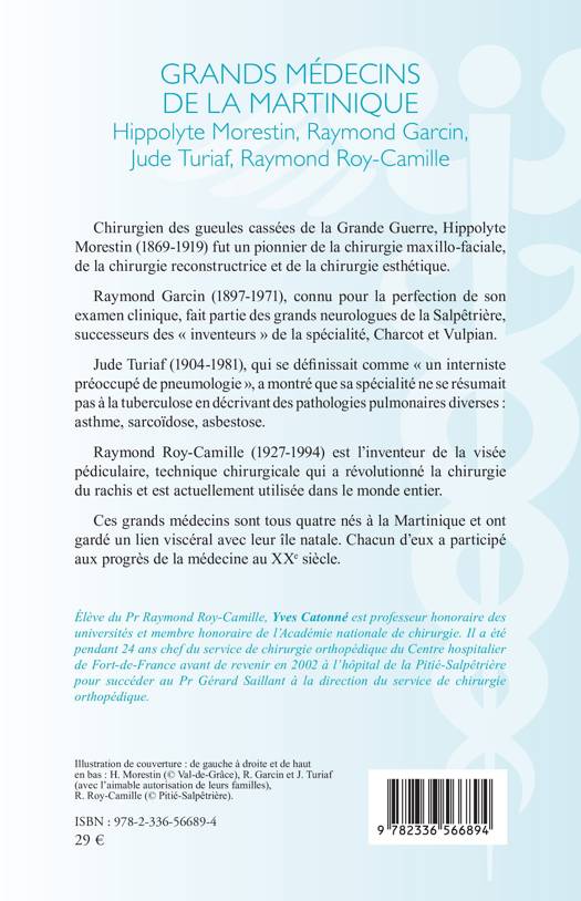 Chirurgien des gueules cassées de la Grande Guerre, Hippolyte Morestin (1869-1919) fut un pionnier de la chirurgie maxillo-faciale, de la chirurgie reconstructrice et de la chirurgie esthétique. Raymond Garcin (1897-1971), connu pour la perfection de son examen clinique, fait partie des grands neurologues de la Salpêtrière, successeurs des inventeurs de la spécialité, Charcot et Vulpian. Jude Turiaf (1904-1981), qui se définissait comme un interniste préoccupé de pneumologie, a montré que sa spécialité ne se résumait pas à la tuberculose en décrivant des pathologies pulmonaires diverses: asthme, sarcoïdose, asbestose. Raymond Roy-Camille (1927-1994) est l'inventeur de la visée pédiculaire, technique chirurgicale qui a révolutionné la chirurgie du rachis et est actuellement utilisée dans le monde entier. Ces grands médecins sont tous quatre nés à la Martinique et ont gardé un lien viscéral avec leur île natale. Chacun d'eux a participé aux progrès de la médecine au XXe siècle.