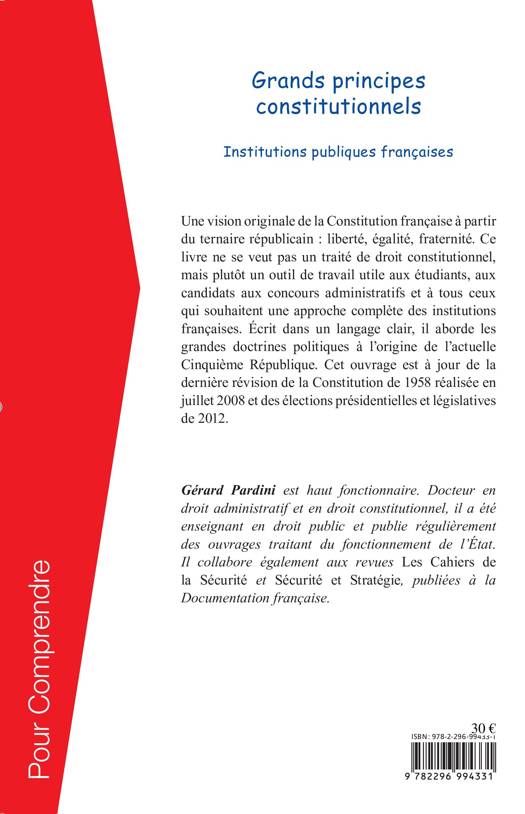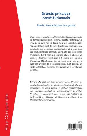 Cet ouvrage propose une vision originale de la constitution française à partir du ternaire républicain : liberté, égalité, fraternité au travers d'une approche complète des institutions françaises. Il aborde les grandes doctrines politiques à l'origine de l'actuelle Cinquième République. Il est à jour de la dernière révision de la Constitution de 1958 réalisée en juillet 2008 et des élections présidentielles et législatives de 2012.