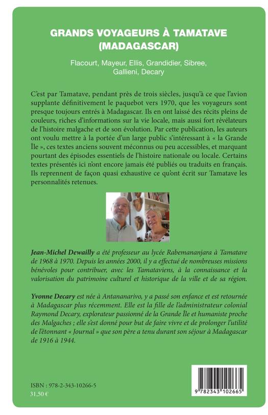 Pendant presque trois siècles, avant que l'avion ne remplace le paquebot, les voyageurs devaient entrer à Madagascar par Tamatave. Ils en ont laissé bon nombre de récits riches d'informations sur la vie locale et révélateurs de l'histoire malgache et de son évolution. Ces textes anciens, souvent méconnus, parfois inédits, décrivent pourtant des épisodes essentiels de l'histoire nationale et locale. Ils reprennent ce qu'ont écrit sur Tamatave les personnalités présentées ici.