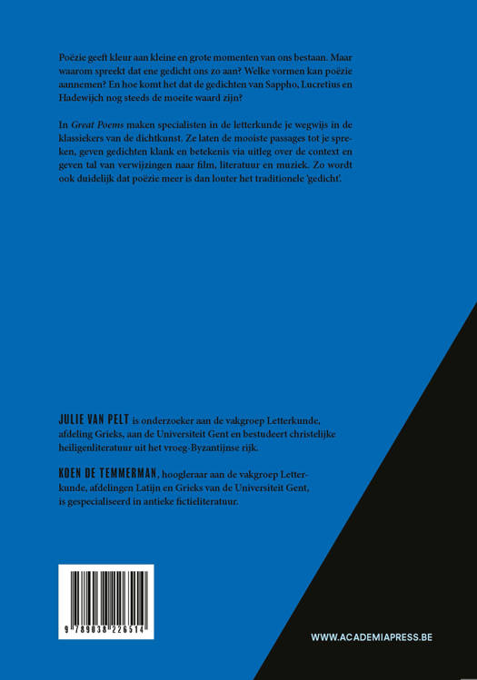 In Great Poems maken specialisten en literatuurliefhebbers je wegwijs in de begeestering van de dichtkunst. Ze laten de mooiste passages tot je spreken, geven gedichten klank en betekenis via uitleg over de context en geven tal van verwijzingen naar film, literatuur en muziek. Zo wordt ook duidelijk dat poëzie meer is dan louter het traditionele 'gedicht'.
