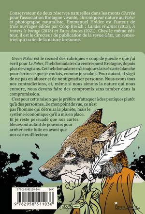 Green Poher est le recueil des rubriques « coup de gueule » que j’ai écrit pour Le Poher, l’hebdomadaire du centre ouest Bretagne, depuis plus de vingt ans. Cet hebdomadaire m’a toujours laissé carte blanche pour écrire ce que je voulais, comme je voulais. Pour autant, il s’agit de ne pas en abuser et de ne stigmatiser personne. Nous avons tous nos contradictions, et, même si nous aimons la nature qui nous entoure, nous devons faire des compromis sans tomber dans la compromission. C’est pour cette raison que je préfère m’attaquer à des pratiques plutôt qu’à des personnes. De mon point de vue, ce n’est pas l’homme qui détruira la planète, mais le système économique qu’il a mis en place. Et je reste persuadé que nos cartes bleues ont autant de pouvoirs pour arrêter cette fuite en avant que nos cartes d’électeur.