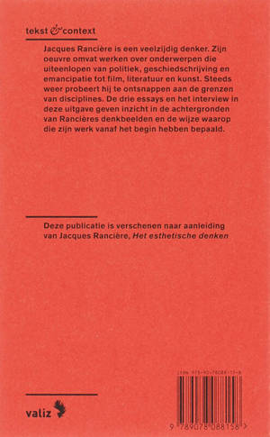 Jacques Rancière is een veelzijdig denker. Zijn oeuvre omvat werken die uiteenlopen van politiek, geschiedschrijving en emancipatie tot film, kunst en literatuur. Steeds probeert hij te ontsnappen aan de grenzen van die disciplines. Deze uitgave geeft met essays en een interview inzicht in de achtergronden van Rancières denken en toont aan welke rode draden er door zijn oeuvre lopen. De nieuwe serie text & context, geïnitieerd door Solange de Boer, is een reeks publicaties die zich richt op stimulering en verdieping van het debat in de kunst en visuele cultuur. Met vertalingen van belangrijke referentiewerken van filosofen en theoretici en een begeleidende essaybundel wordt iedere keer de basis gelegd voor een goed beargumenteerd debat over een actueel onderwerp.