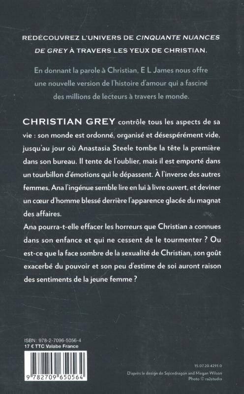 Redécouvrez Cinquante Nuances de Greyà travers les yeux de Christian. CHRISTIAN GREY contrôle tous les aspects de sa vie : son monde est ordonné, organisé et désespérément vide, jusqu’au jour où Anastasia Steele tombe la tête la première dans son bureau. Il tente de l’oublier, mais il est emporté dans un tourbillon d’émotions qui le dépassent. À l’inverse des autres femmes, Ana l’ingénue semble lire en lui à livre ouvert, et deviner un cœur d’homme blessé derrière l’apparence glacée du magnat des affaires. Ana pourra-t-elle effacer les horreurs que Christian a connues dans son enfance et qui ne cessent de le tourmenter ? Ou est-ce que la face sombre de la sexualité de Christian, son goût exacerbé du pouvoir et le peu d’estime de soi qui le consume auront raison des sentiments de la jeune femme ?