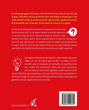Je wilt graag opgeruimd leven, maar het lukt je maar niet om aan de slag te gaan. Omdat je gehinderd wordt door onhandige overtuigingen ('het moet perfect') of omdat je moeite hebt de eerste stap te zetten, spullen los te laten of je motivatie vast te houden. En dus heeft de chaos je in de greep. In Grip op de chaos geeft organizer Els Jacobs van De HuishoudCoach de zeven sleutels in handen waarmee je uit deze impasse komt. In deel 1 geeft ze inzicht in alle facetten van chaos: wat is chaos, waarom leef je in chaos en hoe ga je er mee om, wat zijn de voor- en nadelen ervan en welke excuses gebruik je om geen actie te ondernemen. In deel 2 ontdek je aan de hand van zeven sleutels wat je blokkades, je motivatie en krachtbronnen zijn, maak je een realistische schets van jouw droomhuis, leer je te focussen op het belangrijkste, maak je kennis met de effectiefste opruimstrategie, zet je jouw automatische opruimpiloot in werking en krijg je tips over hoe je jezelf kunt belonen. Zodat je elke dag kunt genieten van een opgeruimd huis en hoofd!