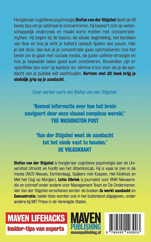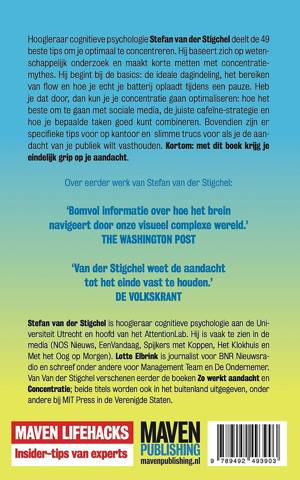 Hoogleraar cognitieve psychologie Stefan van der Stigchel deelt de 50 beste tips om je optimaal te concentreren, of je nu thuis of op kantoor werkt. Hij baseert zich op wetenschappelijk onderzoek en maakt korte metten met concentratiemythes. Hij begint bij de basics: de ideale dagindeling, het bereiken van flow en hoe je echt je batterij oplaadt tijdens een pauze. Heb je dat door, dan kun je je concentratie gaan optimaliseren: hoe het beste om te gaan met sociale media, de juiste cafeïne-strategie en hoe je bepaalde taken goed kunt combineren. Deze herziene editie bevat bovendien een paar gloednieuwe thuiswerktips die je helpen om ook op afstand geconcentreerd te werken.