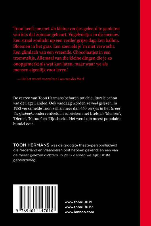 'Toon heeft me met z'n kleine versjes geleerd te genieten van iets dat zomaar gebeurt. Vogelvoetjes in de sneeuw. Een straal zonlicht op een verder grijze dag. Een ballon. Bloemen in het gras. Een zoen als je 'm niet verwacht. Een glimlach van een vreemde. Chocolaatjes in een trommeltje. Allemaal van die kleine dingen die je zo onopgemerkt als wat kan laten, maar waar we als mensen eigenlijk voor leven.' - Uit het woord vooraf van Lars van der Werf De verzen van Toon Hermans behoren tot de culturele canon van de Lage Landen. Ook vandaag worden ze veel gelezen. In 1983 verzamelde Toon zelf al meer dan 450 versjes in het Groot Versjesboek, onderverdeeld in rubrieken met titels als 'Mensen', 'Dieren', 'Natuur' en 'Tijdsbeeld'. Het werd zijn meest populaire bundel ooit.