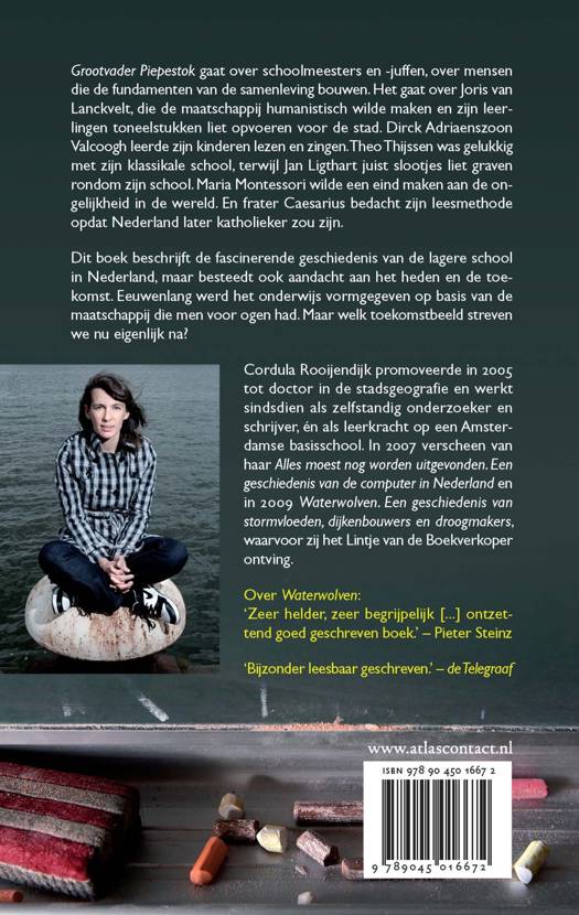 Grootvader Piepestok gaat over schoolmeesters en -juffen, over mensen Cordula Rooijendijk die de fundamenten van de samenleving bouwen. Het gaat over Joris van Lanckvelt, die de maatschappij humanistisch wilde maken en zijn leerlingen toneelstukken liet opvoeren voor de stad. Dirck Adriaenszoon Valcoogh leerde zijn kinderen lezen en zingen. Theo Thijssen was gelukkig met zijn klassikale school, terwijl Jan Ligthart juist slootjes liet graven rondom zijn school.Maria Montessori wilde een eind maken aan de ongelijkheid in de wereld. En frater Caesarius bedacht zijn leesmethode opdat Nederland later katholieker zou zijn.