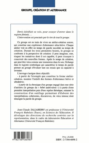 Denis falsifiait sa voix, pour essayer d'entrer dans le registre féminin... L'intervention est ponctuée par le rire de tout le groupe. Ce groupe est en train de vivre un atelier-création sonore, qui constitue une expérience d'alternance ultra-brève. Chaque atelier voit en effet un temps de parole succéder au temps de création. Durant les trois premières heures, le groupe se confronte à la perspective de création; il peut imaginer, oser, risquer les tentatives dont il est capable, il peut s'essayer à concevoir des nouvelles formes. Après le temps de création, qui peut être vécu comme une immersion dans le son, l'échange dans le registre symbolique qui caractérise le temps de parole permet au groupe d'évaluer tant ses essais que sa capacité à inventer.