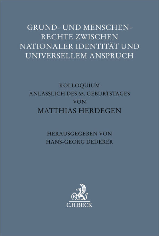 Zum Werk Im Jahr 2022 fand anlässlich des 65. Geburtstages von Professor Matthias Herdegen ein Kolloquium im Festsaal der Universität Bonn statt, das Werner Gephart, Thilo Rensmann, Ulrich Schlie, Tade M. Spranger und der Herausgeber Hans-Georg Dederer ihm zu Ehren veranstalteten. Viele dem Jubiliar persönlich verbundene, enge Freunde und Weggefährten versammelten sich mit Beiträgen zur Themenstellung "Grund- und Menschenrechte zwischen nationaler Identität und universellem Anspruch", die auf einen Kern des Schaffens von Matthias Herdegen abzielt. In den drei wesentlichen Blöcken "Nationale Verfassungsidentität und universelle Menschenrechte", "Extraterritoriale Geltung der Grundrechte" und "Nationale Identität und universeller Anspruch der Gund- und Menschenrechte im Europäischen Grundrechtsraum" wird ein Thema, das wohl nie an Bedeutung verlieren wird, von verschiedenen Seiten beleuchtet; ein Thema, dessen Virulenz gerade angesichts des völkerrechtswidrigen Angriffskrieges der Russischen Föderation auf die Ukraine nicht größer sein könnte.