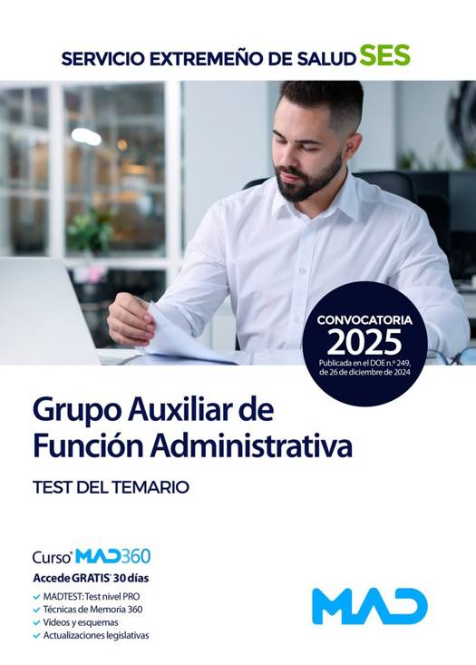 Manual de test para la preparación de las pruebas de acceso al Grupo Auxiliar de Función Administrativa en las Instituciones Sanitarias del Servicio Extremeño de Salud, conforme a la Resolución de 19 de diciembre de 2024, de la Dirección Gerencia, por la que se convoca proceso selectivo para el acceso a la condición de personal estatutario fijo en esta categoría (DOE n.º 249, de 26 de diciembre de 2024).Contiene preguntas de todos los temas que componen dicho temario, tanto de la parte común como de la específica, actualizadas y adaptadas a las novedades que les afectan. Además, para una adecuada preparación de la materia, en el Curso MAD360 tienes más preguntas de todos los temas con las que favorecer tu autoevaluación y la comprobación de los conocimientos adquiridos. ÍndiceTEST DEL TEMARIO COMÚNTest n.º 1. La Constitución Española de 1978: características y estructura. Título Preliminar. Los derechos y deberes fundamentalesTest n.º 2. El Estatuto de Autonomía de Extremadura: Estructura y modificaciones. Título Preliminar. Las competencias. Las instituciones de ExtremaduraTest n.º 3. El Estatuto Marco del Personal Estatutario de los Servicios de Salud: Normas generales. Clasificación del personal estatutario. Derechos y deberes. Adquisición y pérdida de la condición de personal estatutario fijoTest n.º 4. Ley de Salud de Extremadura: objeto, ámbito y principios rectores. El Sistema Sanitario Público de Extremadura: disposiciones generales y derechos y deberes de los ciudadanos respecto al Sistema Sanitario. Los Estatutos del Organismo Autónomo Servicio Extremeño de Salud TEST DEL TEMARIO ESPECÍFICOTest n.º 1. La Constitución Española de 1978: La Corona. Las Cortes Generales. El Gobierno y la Administración. Las relaciones entre el Gobierno y las Cortes Generales. El Poder Judicial. Economía y Hacienda. La organización territorial del Estado. El Tribunal Constitucional. La reforma constitucionalTest n.º 2. Ley del Régimen Jurídico del Sector Público: Disposiciones generales. Los órganos de las Administraciones Públicas. Principios de la potestad sancionadora. De la responsabilidad Patrimonial de las administraciones públicas. Funcionamiento Electrónico del sector público. Los ConveniosTest n.º 3. Ley del Procedimiento Administrativo Común de las Administraciones Públicas (I): Disposiciones generales. Los interesados en el procedimientoTest n.º 4. Ley del Procedimiento Administrativo Común de las Administraciones Públicas (II): La actividad de las Administraciones Públicas. Los actos administrativosTest n.º 5. Ley del Procedimiento Administrativo Común de las Administraciones Públicas (III): Las disposiciones sobre el procedimiento administrativo comúnTest n.º 6. Ley del Procedimiento Administrativo Común de las Administraciones Públicas (IV): La revisión de los actos en vía administrativa. La iniciativa legislativa y de la potestad para dictar reglamentos y otras disposicionesTest n.º 7. La información administrativa y atención al ciudadano en la Comunidad Autónoma de Extremadura. El sistema de registro único de la Comunidad Autónoma de Extremadura. El régimen jurídico de la administración electrónica de la Comunidad Autónoma de Extremadura: Disposiciones. Puntos de accesos electrónicos corporativos. Expediente electrónico. Comunicaciones y notificaciones electrónicasTest n.º 8. Los contratos del sector público: Disposiciones generales: Objeto y ámbito de aplicación de la ley. Contratos del sector público. Disposiciones generales sobre la contratación del sector público. Partes en el contratoTest n.º 9. El Estatuto Básico del Empleado Público: objeto y ámbito de aplicación. El personal al servicio de las Administraciones Públicas. Ley de Función Pública de Extremadura: objeto, principios rectores y ámbito de aplicación. Órganos competentes en materia de función Pública. Personal al Servicio de las Administraciones Públicas de ExtremaduraTest n.º 10. El Estatuto Marco del personal estatutario de los Servicios de Salud (I): provisión de plazas, selección y promoción interna. Movilidad del personal. Carrera profesional. Jornada de trabajo, permisos y licencias. Situaciones del personal estatutario. Régimen disciplinarioTest n.º 11. El Estatuto Marco del personal estatutario de los Servicios de Salud (II): retribuciones. Criterios Generales. Retribuciones básicas, complementarias y del personal temporalTest n.º 12. El Régimen General de la Seguridad Social (I): campo de aplicación. Inscripción de empresas y normas sobre afiliación, cotización y recaudación. Aspectos comunes a la acción protectoraTest n.º 13. Ley General de la Seguridad Social (II): régimen General de la Seguridad Social: incapacidad temporal. Nacimiento y cuidado de menor. Corresponsabilidad en el cuidado del lactante. Riesgo durante el embarazo. Riesgo durante la lactancia natural. Cuidado de menores afectados por cáncer u otra enfermedad grave. Incapacidad permanente contributiva. Lesiones permanentes no incapacitantes. Jubilación en su modalidad contributivaTest n.º 14. Ley General de Sanidad: el derecho a la protección de la salud. El sistema de salud. Las competencias de las Administraciones Públicas. La estructura del Sistema Sanitario Público: la organización general del sistema sanitario público, los Servicios de Salud de las Comunidades Autónomas y las Áreas de SaludTest n.º 15. Ley de Salud de Extremadura (I): organización general del Sistema Sanitario Público de Extremadura: componentes del sistema, ordenación territorial y ordenación funcionalTest n.º 16. Ley de Salud de Extremadura (II): Servicio Extremeño de Salud. La estructura orgánica del Servicio Extremeño de Salud en las áreas de Salud de la Comunidad Autónoma de Extremadura y la composición, atribuciones y funcionamiento de los Consejos de Salud de ÁreaTest n.º 17. El usuario del Sistema Nacional de Salud: sus der