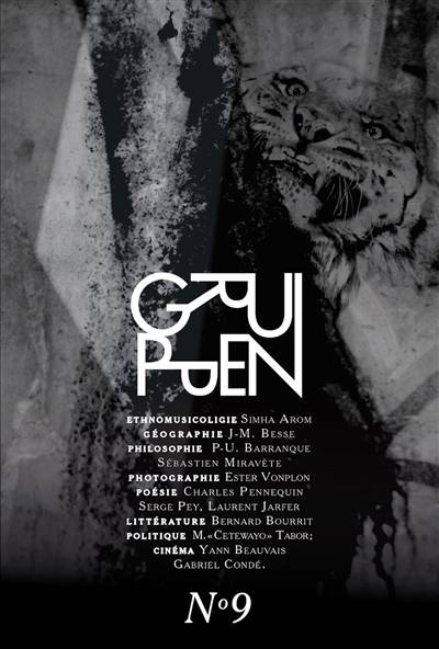 Entrevue avec SIMHA AROM (ethnomusicologie) Des Pygmées à Ligeti. Politique MICHAEL « CETEWAYO » TABOR, N.Y. PANTHER 21 Capitalisme plus Came égale génocide. Géographie JEAN-MARC BESSE Géographie psychique. Notes sur lespace comme sentiment. Cinéma YANN BEAUVAIS Ryan Trecartin Internet comme mode de vie. GABRIEL CONDÉ Le cinéma des « sales ». Entre-vues dune politique du cinéma. Photographies ESTER VONPLON Und in der Nähe die See. Poésie CHARLES PENNEQUIN Je sais plus. SERGE PEY Paroles et leçons à lusage des écoliers qui veulent changer le monde. LAURENT JARFER Obstétrique et cinéma (I) Philosophie SÉBASTIEN MIRAVÈTE Comment Bergson est-il devenu Bergson ? P-U BARRANQUE Idéologie des classes dominantes et vérité artistique chez Marx et Engels Littérature BERNARD BOURRIT Lavenir du cirque en marche.