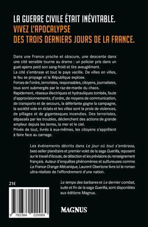 Les événements décrits dans Le jour où tout s'embrasa, best-seller planétaire et premier volet de la saga Guerilla, reposent sur le travail d'écoute, de détection et les prévisions du renseignement français. Auteur d'enquêtes phénomènes et sulfureuses comme La France Orange Mécanique, Laurent Obertone livre ici le roman ultra-réaliste de l'effondrement d'une nation.