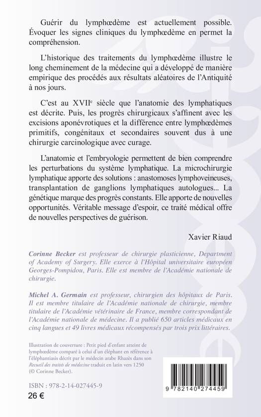 Guérir du lymphoedème est actuellement possible. Évoquer les signes cliniques du lymphoedème en permet la compréhension. L’historique des traitements du lymphoedème illustre le long cheminement de la médecine qui a développé de manière empirique des procédés aux résultats aléatoires de l’Antiquité à nos jours. C’est au XVIIe siècle que l’anatomie des lymphatiques est décrite. Puis, les progrès chirurgicaux s’affinent avec les excisions aponévrotiques et la différence entre lymphoedèmes primitifs, congénitaux et secondaires souvent dus à une chirurgie carcinologique avec curage. L’anatomie et l’embryologie permettent de bien comprendre les perturbations du système lymphatique. La microchirurgie lymphatique apporte des solutions : anastomoses lymphoveineuses, transplantation de ganglions lymphatiques autologues... La génétique marque des progrès constants. Elle apporte de nouvelles opportunités. Véritable message d’espoir, ce traité médical offre de nouvelles perspectives de guérison.