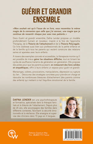 « Mon souhait est qu’à l’issue de ce livre, vous ressentiez la même magie de la connexion que celle que j’ai connue ; une magie que je continue de ressentir chaque jour avec mes patients. » Dans Guérir et grandir ensemble, Dafna Lender propose un modèle profondément humain et novateur, inspiré à la fois de l’approche Theraplay, de la Théorie de l’attachement et de la Théorie Polyvagale. Ce livre s’adresse aussi bien aux professionnels de la petite enfance et de la famille qu’à tous les parents qui veulent construire des relations saines et apaisées avec leurs enfants. À travers des exemples concrets et accessibles, la thérapeute montre qu’il est possible de mieux gérer les situations difficiles, tout en brisant les cycles de souffrance transmis de génération en génération. Elle propose des pistes pour que les parents puissent, en instaurant des liens solides et empathiques, offrir à leurs enfants un espace pour guérir et grandir. Mensonges, colères, provocations, manipulations, dépression ou rupture du lien… Découvrez des stratégies concrètes pour prendre en charge et résoudre les nombreuses blessures d’attachement (des parents comme des enfants) qui mettent à mal l’équilibre émotionnel de la famille