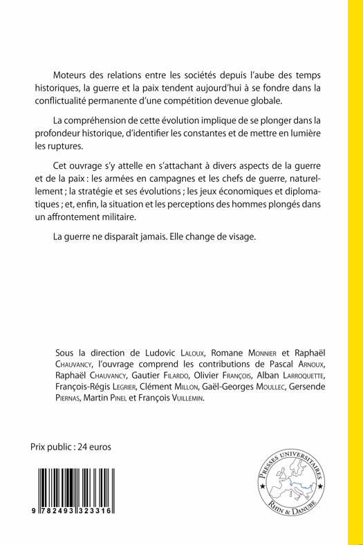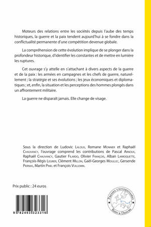Moteurs des relations entre les sociétés depuis l’aube des temps historiques, la guerre et la paix tendent aujourd’hui à se fondre dans la conflictualité permanente d’une compétition devenue globale. La compréhension de cette évolution implique de se plonger dans la profondeur historique, d’identifier les constantes et de mettre en lumière les ruptures. Cet ouvrage s’y attelle en s’attachant à divers aspects de la guerre et de la paix : les armées en campagnes et les chefs de guerre, naturellement ; la stratégie et ses évolutions ; les jeux économiques et diplomatiques ; et, enfin, la situation et les perceptions des hommes plongés dans un affrontement militaire. La guerre ne disparaît jamais. Elle change de visage.