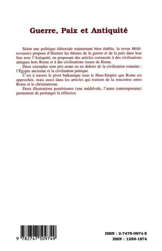 Ce numéro propose d'illustrer les thèmes de la guerre et de la paix dans leur lien avec l'Antiquité, en proposant des articles consacrés à des civilisations antiques hors Rome et à des civilisations issues de Rome. C'est à travers le pivot balkanique sous le Haut-Empire que Rome est approchée, mais aussi dans les articles qui traitent de la rencontre entre Rome et le christianisme.