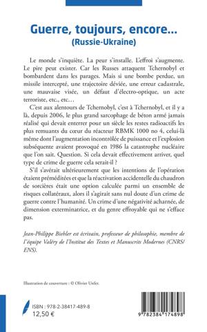 Le monde s'inquiète. La peur s'installe. L'effroi s'augmente. Le pire peut exister. Car les Russes attaquent Tchernobyl et bombardent dans les parages. Mais si une bombe perdue, un missile intercepté, une trajectoire déviée, une erreur cadastrale, une mauvaise visée, un défaut d'électro-optique, un acte terroriste, etc., etc.. C'est aux alentours de Tchernobyl, c'est à Tchernobyl, et il y a là, depuis 2006, le plus grand sarcophage de béton armé jamais réalisé qui devait enterrer pour un siècle les restes radioactifs les plus remuants du cur du réacteur RBMK 1000 no 4, celui-là même dont l'augmentation incontrôlée de puissance et l'explosion subséquente avaient provoqué en 1986 la catastrophe nucléaire que l'on sait. Question ? Si cela devait effectivement arriver, quel type de crime de guerre cela serait-il ? S'il s'avérait ultérieurement que les intentions de l'opération étaient préméditées et que la réactivation accidentelle du chaudron de sorcières était une option calculée parmi un ensemble de risques collatéraux, alors il s'agirait sans nul doute d'un crime de guerre contre l'humanité. Un crime d'une négativité acharnée, de dimension exterminatrice, et du genre effroyable qui ne s'efface pas.