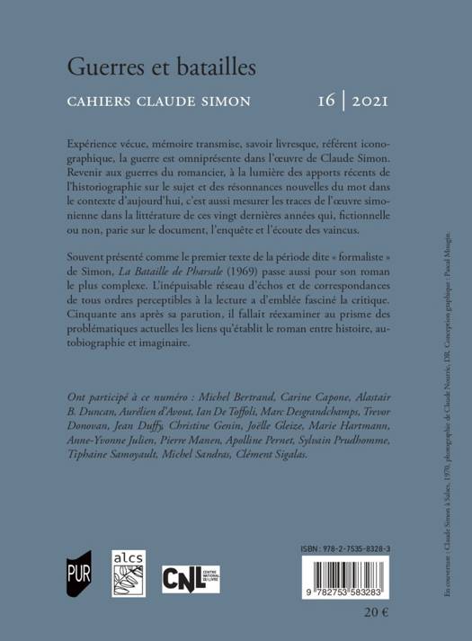 Expérience vécue, mémoire transmise, savoir livresque, référent iconographique, la guerre est omniprésente dans l'oeuvre de Claude Simon. Revenir aux guerres du romancier, à la lumière des apports récents de l'historiographie sur le sujet et des résonnances nouvelles du mot dans le contexte d'aujourd'hui, c'est aussi mesurer les traces de l'oeuvre simonienne dans la littérature de ces vingt dernières années qui, fictionnelle ou non, parie sur le document, l'enquête et l'écoute des vaincus.