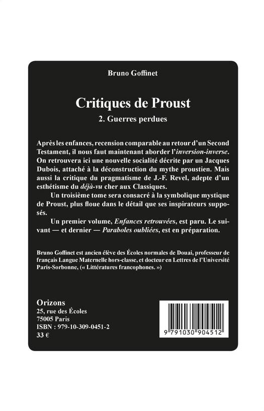 Après les enfances, recension comparable au retour d'un Second Testament, il nous faut maintenant aborder l'inversion-inverse. On retrouvera ici une nouvelle socialité décrite par un Jacques Dubois, attaché à la déconstruction du mythe proustien. Mais aussi la cri-tique du pragmatisme de J.-F. Revel, adepte d'un esthétisme du dé-jà-vu cher aux Classiques. Un troisième tome sera consacré à la symbolique mystique de Proust, plus floue dans le détail que ses inspirateurs supposés. Un premier volume, Enfances retrouvées, est paru. Le suivant ? et dernier ? Paraboles oubliées, est en préparation.