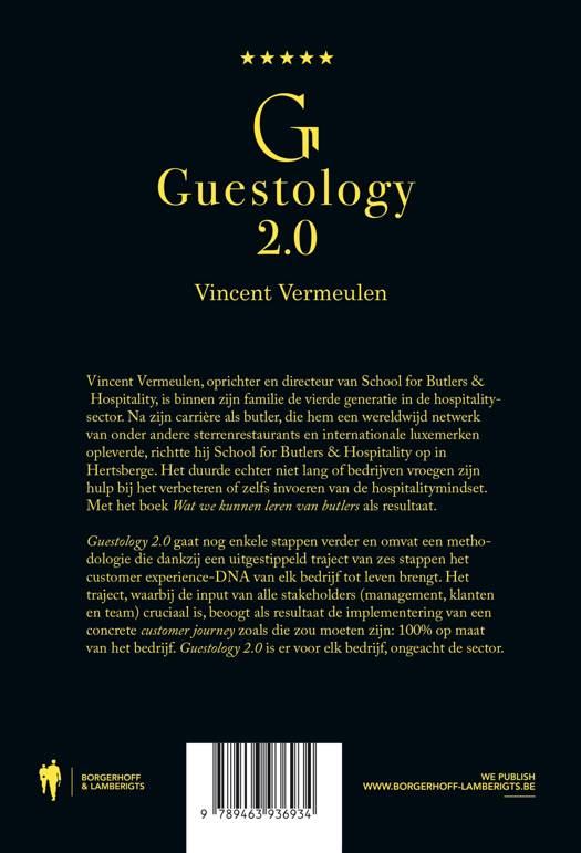 Vincent Vermeulen, oprichter en directeur van School for Butlers & Hospitality, is binnen zijn familie de vierde generatie die zijn sporen verdiende in de hospitalitysector. Na zijn carrière als butler, die hem een wereldwijd netwerk van onder andere sterrenrestaurants en internationale luxemerken opleverde, richtte hij School for Butlers op in Brugge. Het duurde echter niet lang of bedrijven vroegen zijn hulp bij het verbeteren of zelfs invoeren van de hospitalitymindset. Dat resulteerde ook in het boek Wat kunnen we leren van butlers.Guestology 2.0 gaat nog enkele stappen verder en omvat een methodologie die dankzij een uitgestippeld traject van zes stappen het customer experience-DNA van elk bedrijf tot leven brengt. Het traject, waarbij de imput van alle stakeholders (management, klanten en team) cruciaal is, beoogt als resultaat de implementering van een concrete customer journey zoals die zou moeten zijn: 100% op maat van het bedrijf. Guestology 2.0 is er voor elk bedrijf, ongeacht de sector.